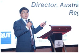 左图:约翰霍普金斯大学曹旭教授作大会报告; 右图:QUT肖殷教授作大会报告